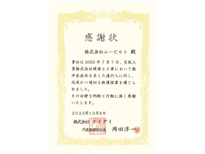 現場での人命救助の対応について、お客様から表彰状をいただきました。